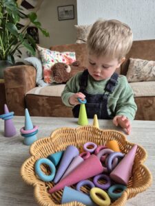 Ik maak veel gebruik van zogenoemd open-einde speelmateriaal; speelgoed, veelal gemaakt van natuurlijk materiaal, dat geen vaststaand doel heeft en daarmee de creativiteit van het kind enorm stimuleert. (Denk aan mooie houten blokken waarmee het kind eindeloos verschillende dingen kan bouwen.) Daarnaast werken we veel met sensorisch materiaal, is er aandacht voor gezonde voeding en gaan we elke dag naar buiten. Op ontdekking in het bos, naar de speeltuin, de bibliotheek of gewoon rondcrossen op de driewielers en stepjes.